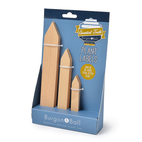 Plant Labels - Burgon and Ball A pack of six plant labels in three sizes. Ideal for marking large plants or vegetables, labelling in plant pots and keeping a record of your seedlings. ... -free in the garden. To re-use, lightly sand to remove writing. FSC certified beech wood. Material: FSC certified beech wood. Label lengths 10cm, 15cm and 20cm. Please note: last order date ...